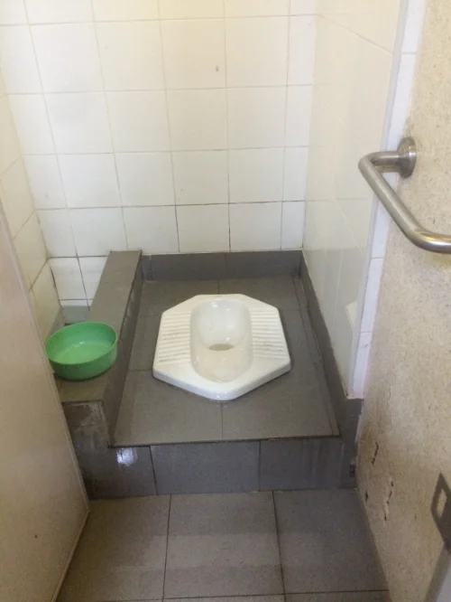 Flushing is a whole different ballgame. There is no automatic-flush. You flush by dumping water into the hole from another bucket of water in the bathroom. The "self-flush." So, not only is water splashing around all over the squat toilet, it’s also all over the bathroom floor. For any squat toilet you use, you'll be wading through a couple inches of cesspool water the entire time you're in there. Umm, gross. No.