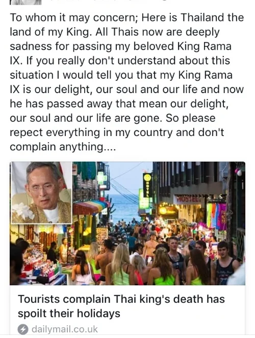 Many Thais are posting statuses like this on their Facebook due to tourists disrespecting their King.
